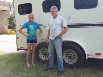 On June 29, 2014, the trailer, just south of Henrietta, Oklahoma on the Indian Nation Turnpike, carried several horses, and the tire’s tread had come off the wheel and became jammed between the tire and the metal fender. Karen, the driver, was travelling with her young teenage daughter to Oklahoma City, and they could not free the wheel from the fender to change the tire. Karen had a wood ramp about 6 inches high which we placed in front of the right front tire; this permitted her to pull the trailer forward so the front tire rolled up the ramp, elevating simultaneously the right rear wheel (with the flat tire) enough so we didn’t need a jack. I got to use my hack saw and bolt cutters (rare occasion for both) to cut away the mangled fender, freeing the tire to be changed. Karen also had no lug wrench with sufficient leverage to loosen several of the lug nuts, so I used my 4-way. Her spare tire was very low on pressure, so my compressor reflated it. I didn’t realize it until I had finished, but Karen had taken several photos as I cut the fender and changed the tire. When we were done she took a pic of me and her daughter standing by the finished work. Karen also later posted a very nice comment on my website (see way below).